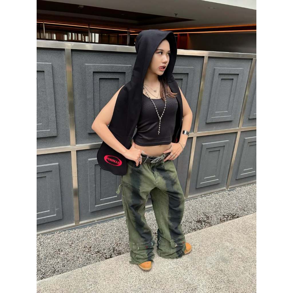 Baggy fit with 4 open pockets below the legs (cut resembles flare or loose fit due to intentionally unfinished hems) & 2 standard pockets and 2 back thigh pockets