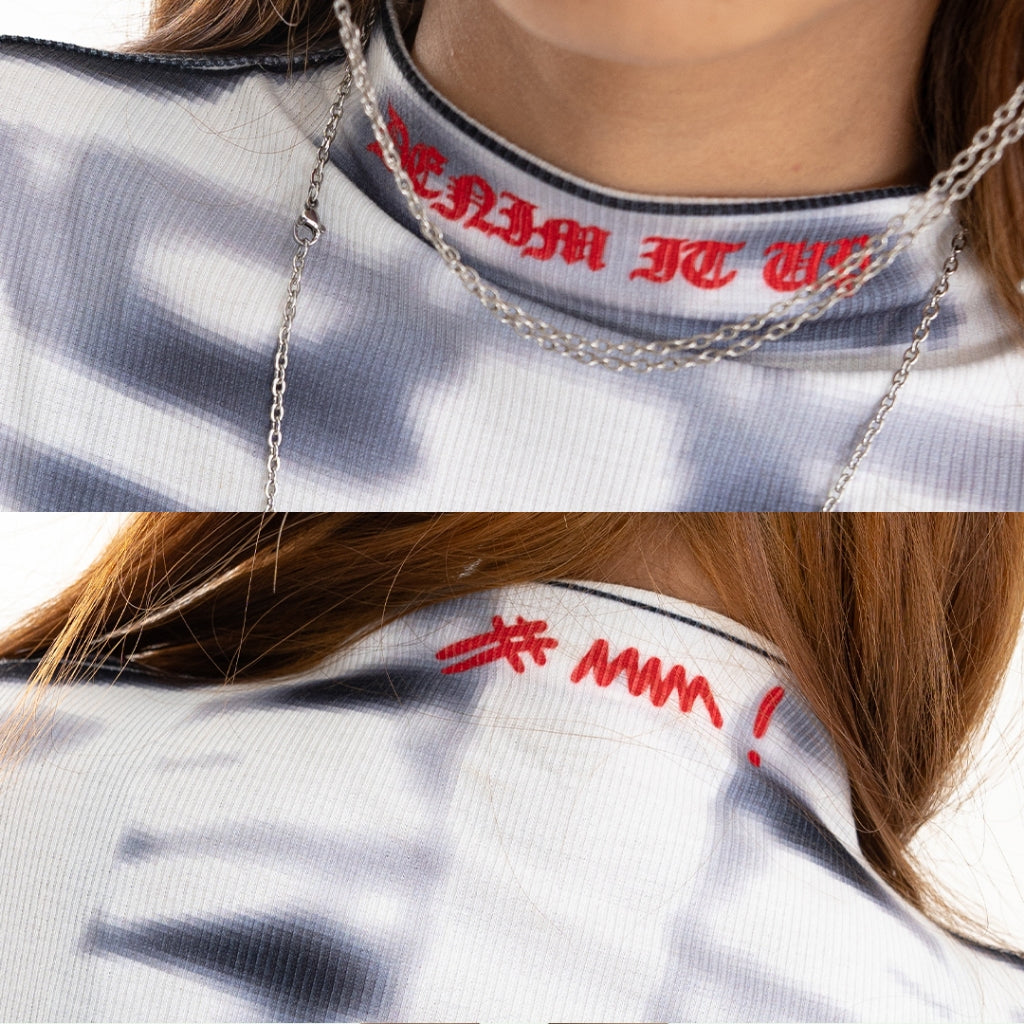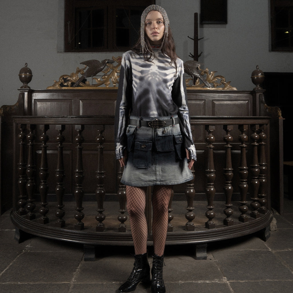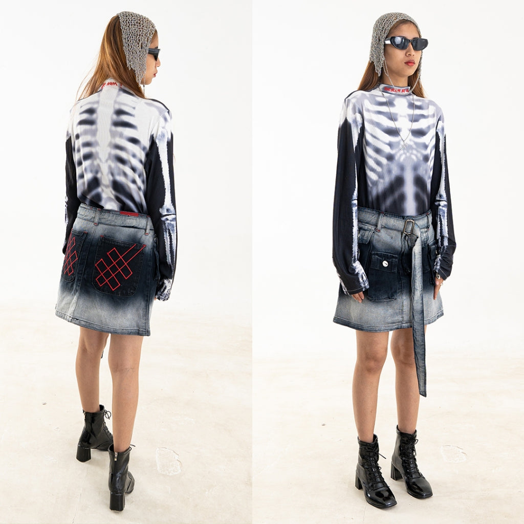 It has our REVELATION theme graphic, this piece showcases TRILOGO details around the neckline and an apocalyptic faded bone texture throughout.